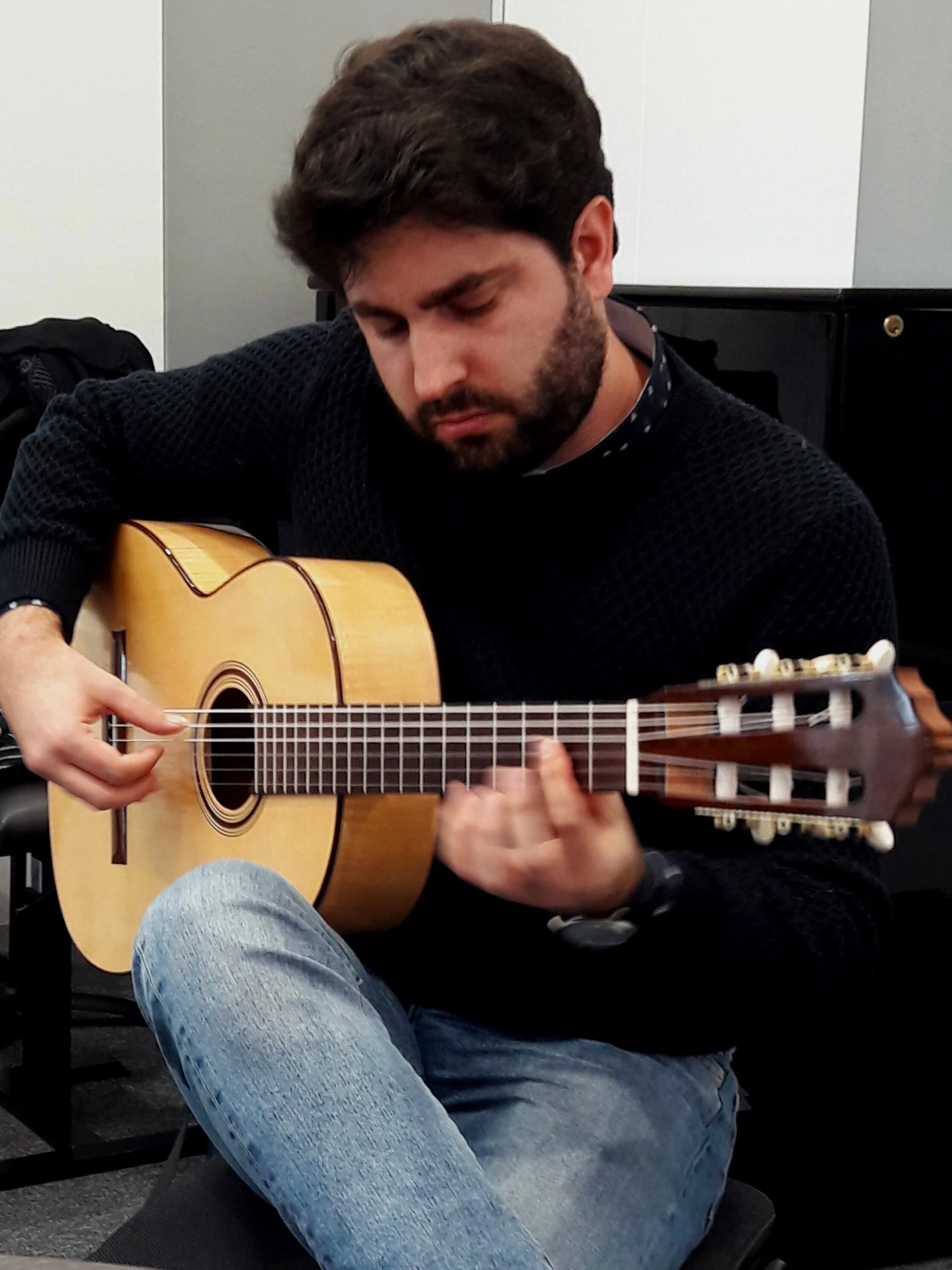 Mark Delpriora Trying out Den Toom Luthier “Ilona” guitar in the Ligita guitar festival. Eschen, Liechtenstein.